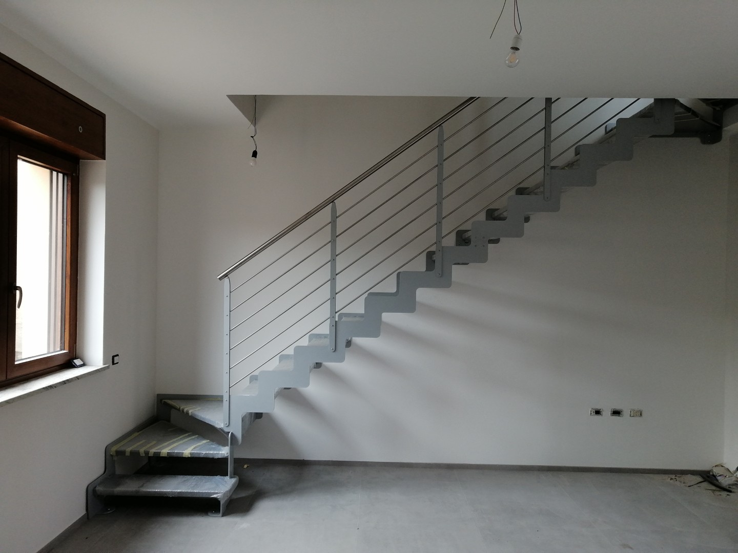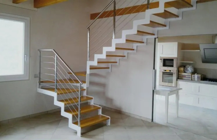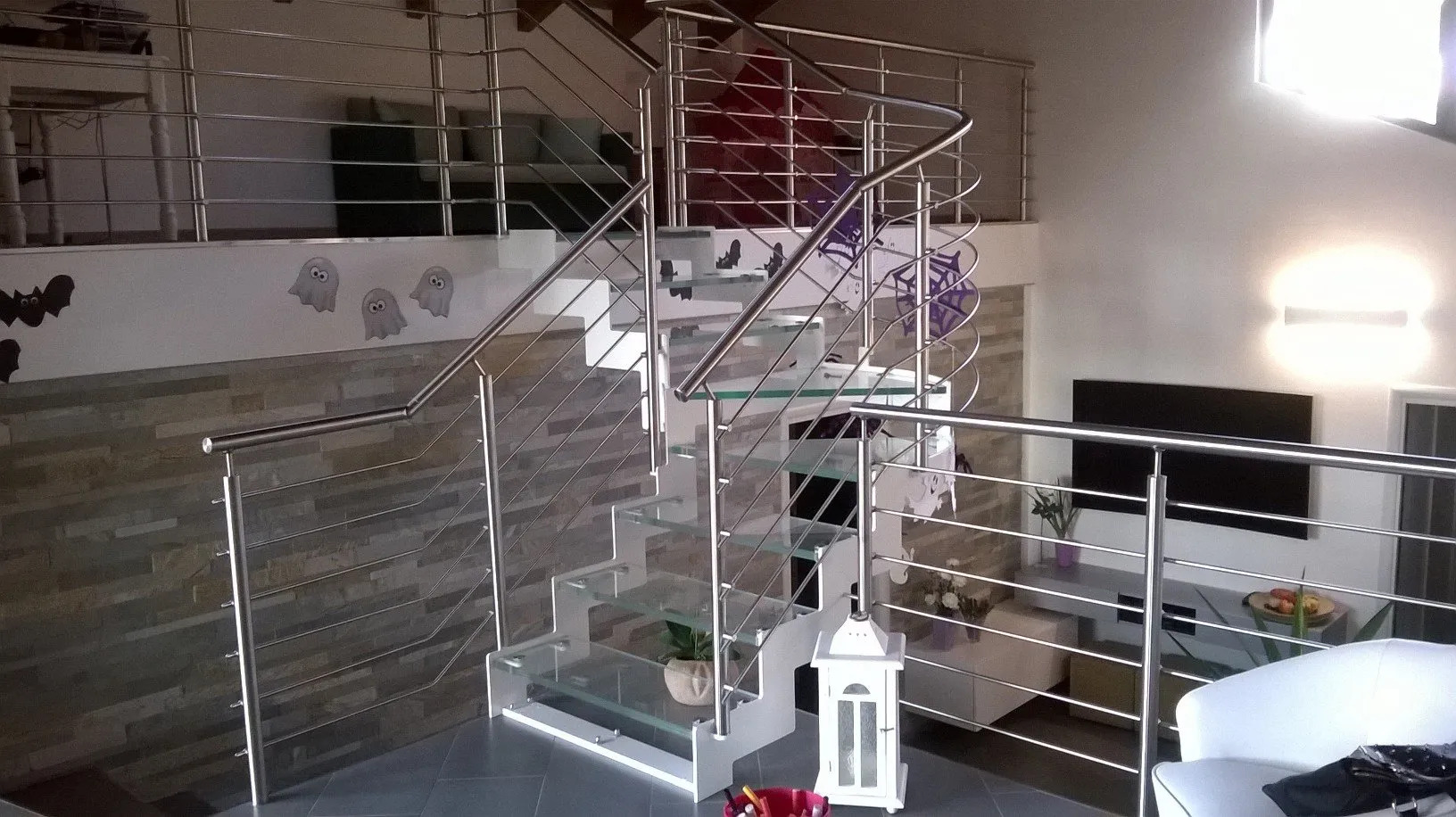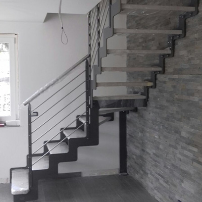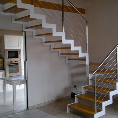 Efferre scale produce scale con doppia lama in ferro. Questi modelli di scale a giorno, progettati su misura, sono realizzati con tecnologia a taglio laser e presentano una doppia struttura portante in metallo. L'andamento della scala può essere a salti o lineare, in base alle specifiche esigenze del cliente. I gradini sono realizzati in legno, mentre le ringhiere sono disponibili in: