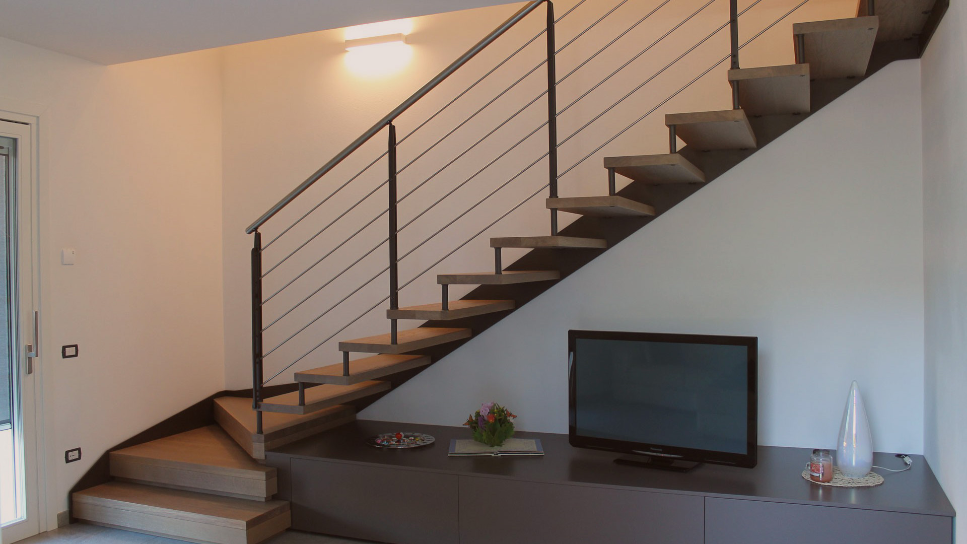 struttura portante a lama metallica o fascia in legno sul lato muro e gradini in